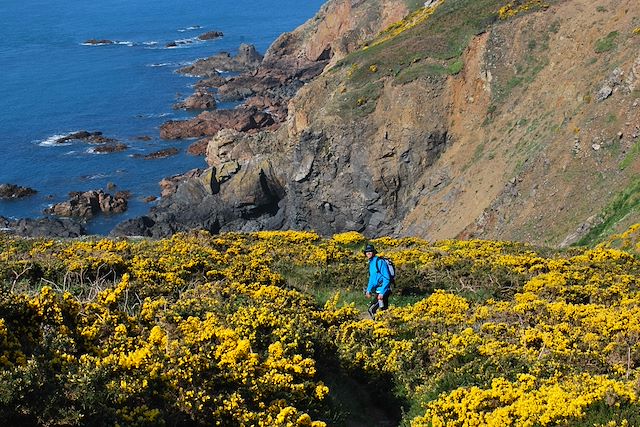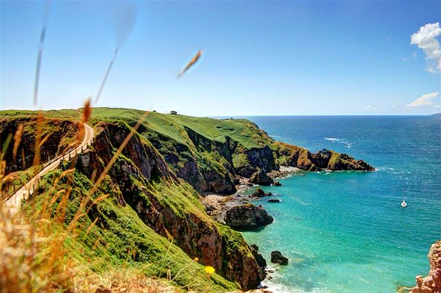 Le matin, départ en bus vers le sud de l'île. Randonnée le long du fameux "Cliff Path", un sentier côtier sur la côte sud, jalonné de nombreuses marches d'escalier. L'itinéraire offre en spectacle de nombreux belvédères sur les îlots, les falaises et la mer écumante. Découverte de sites emblématiques de la côte comme Icart Point ou Petit Bot Bay. Une magnifique dernière journée de randonnée sur Guernesey. Retour à St Peter Port en bus.