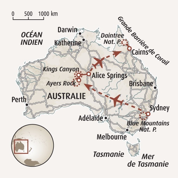 De l’autre côte de la Terre, à plus de 15 000 km, se trouve l’Australie, un véritable pays-continent aux multiples facettes. Le moins que l’on puisse dire c’est qu’un voyage en Australie se mérite ! Cet itinéraire est constitué des sites les plus incroyables du pays. D’abord Sydney, la plus grande ville australienne, avec son port, son Opéra et ses plages ; et à moins de 2 heures de route, le parc national des Blue Mountains avec ses immenses forêts d’eucalyptus et ses étonnantes formations géologiques. Cap ensuite en plein centre, dans "l’Outback", pour découvrir le majestueux Kings Canyon et l’incontournable Uluru, phénomène naturel encore mystérieux et site sacré pour les Aborigènes, les premiers habitants du pays. On marche également sur le Larapinta Trail, le plus célèbre trek du centre rouge de l'Australie. On termine le séjour en beauté dans la région du Queensland avec une découverte de la mythique Grande Barrière de corail et des randonnées dans la forêt tropicale du parc national de Daintree.