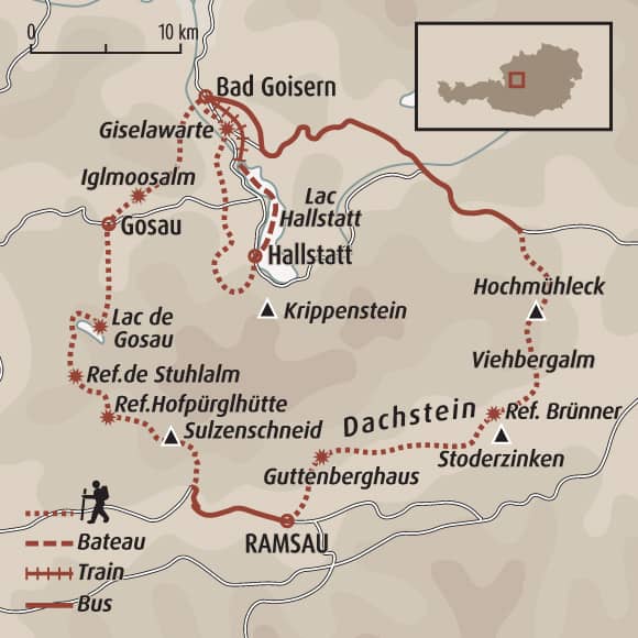 Vous quittez Bad Goisern et randonnez jusqu’à la tour panoramique de Giselawarte. Vous traversez alors un superbe territoire rural typiquement autrichien et rejoignez le Soleweg, ou chemin de la saline, qui longe la conduite historique de saumure jusqu'à la mine de sel de Hallstatt (possibilité de visiter la mine de sel). Depuis la tour de Rudolf (Rudolfsturm), vous jouissez d’une vue magnifique sur Hallstatt et la montagne du Krippenstein. C’est à bord du téléphérique que vous descendez au célèbre village d’Hallstatt, inscrit au patrimoine mondial de l'Unesco. Prenez le temps d’admirer le charme de ses maisons et ses nombreuses curiosités avant de retourner à Bad Goisern en bateau puis en train.