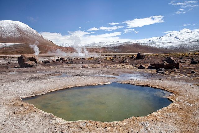 Très tôt le matin, départ en direction des Geysers du Tatio situés à 4300m. Un petit déjeuner est prévu en pleine nature. Arrivée au lever du soleil, heure où les geysers sont les plus spectaculaires. Avec près de 80 geysers actifs, El Tatio est le plus grand site de l'hémisphère sud. Malgré le nombre important de geysers, ceux-ci ne sont pas très hauts : l'éruption la plus haute atteint 6 mètres. Le site se visite à l’aube, lorsque la différence de température (il peut geler jusqu’à –20°C) permet d’admirer la formation des cheminées de vapeur. Sur le chemin du retour, nous observons le petit village de Machuca et sa petite église pittoresque depuis un mirador. Nous nous arrêtons au bord de petites lagunes pour y observer l’avifaune locale avant de retourner au village de San Pedro d’Atacama. Départ pour la Cordillère de Sel, située entre celle de Domeyko et les Andes. Enfin, nous découvrons la Vallée de la Lune, anciennement appelée "Las Salinas", pour son passé minier. Nous visitons le Cratère Central, pour avoir la meilleure vue sur la vallée, l'amphithéâtre et bien sûr, les "Tres Marías", formations géologiques que le célèbre Père Gustavo Le Paige a nommées il y a tant d'années. Nous observons les figures formées par l'érosion et recouvertes d'un voile de sel et contemplons le soleil disparaître derrière les dunes.