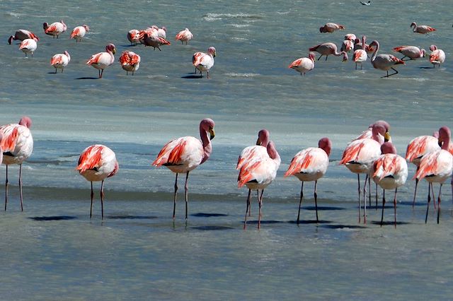 La piste se prolonge jusqu´aux thermes de Polques (4000m). Les plus courageux pourront profiter d´un bain avec vue sur la Laguna Chalviri. Direction la frontière avec le Chili. Sur la route, on pourra apercevoir le célèbre « Désert de Dali » avec ses paysages surnaturels aux tons ocre clair parsemés de rochers isolés. Finalement, arrivée au bout du bout de la Bolivie avec la Laguna Blanca et surtout la Laguna Verde (4300m) avec sa couleur émeraude et en toile de fond le volcan Licancabur. Passage d’un col qui frôle les 5.000 mètres d'altitude avant de s´arrêter au site du « Sol de Mañana » (4850m). Découverte de cette zone caractérisée par de nombreux geysers, fumerolles ou marres de boue. Nous continuons avec la Laguna Colorada, une pause prolongée est nécessaire afin de contempler cette lagune exceptionnelle. Celle-ci accueille de nombreuses colonies de flamants roses qui se pavanent sous nos yeux. Nuit au refuge de Huayllajara situé à proximité de la laguna Colorada.
