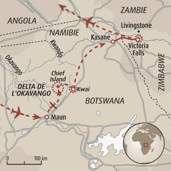 Aujourd'hui, votre guide vous conduit jusqu’à la piste de brousse, où vous embarquez pour un vol en avion-taxi vers Kasane. L’horaire exact du vol n’est pas défini à l’avance et vous sera communiqué la veille par le lodge.