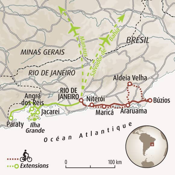 Cet itinéraire est conçu pour découvrir d'une manière originale Rio de Janeiro et sa région en laissant le rythme du vélo guider la découverte et pour vivre une aventure en mouvement. Chaque étape mêle nature vivante, rencontres simples et sensations en plein air pour des voyageurs curieux aimant alterner effort doux, exploration urbaine et grands espaces naturels. Dès l’arrivée à Rio de Janeiro, nous déambulons entre quartiers historiques, lieux emblématiques et plages avant de nous élever en téléphérique vers le Pain de Sucre, baignés de lumière. Nous nous élançons dans la canopée de la forêt tropicale de Tijuca, la plus grande forêt urbaine du monde, découvrons le Corcovado et ressentons la fraîcheur végétale avant de retrouver l’océan. Au fil de la baie de Guanabara, entre architecture contemporaine et villages de pêcheurs, nous parcourons les pages d’histoire d’un Brésil authentique, sur les traces de Darwin et à la découverte de la faune endémique du pays, entre réserve de l'UNESCO, lagunes salines et longues plages jusqu’aux criques apaisantes de la péninsule de Búzios.