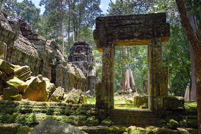 Suivant le fil de l’Histoire, nous partons à la découverte des réalisations titanesques de Jayavarman VII, le plus célèbre des rois khmers. Le temple de Ta Prohm et ses arbres fromagers semblent tout droit sortis d'un rêve. Nous visitons le monument tôt le matin pour éviter les heures les plus fréquentées. Nous poursuivons ensuite cette aventure à vélo dans la forêt tropicale, du temple de Ta Nei au temple de Preah Khan où nous apercevons les oiseaux gigantesques qui ornent son mur d’enceinte. Nous suivons enfin le Grand Circuit tracé au siècle dernier par les Français jusqu’au site d’Angkor Thom. La Place Royale de la "Grande Cité" est marquée par la présence du plus mystérieux de ses monuments, le Bayon, dernier temple-montagne d’Angkor.