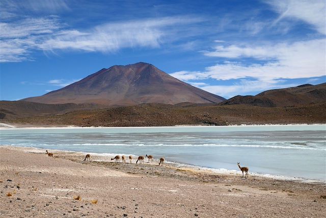 A peine arrivés au pied de l’Altiplano, nous découvrons le célèbre site des geysers du Tatio, puis San Pedro de Atacama, où le ciel est d’une pureté sans égale. Les Lagunas Miscanti et Miñiques, perles de l’Altiplano chilien, étalent leurs eaux azur dans un écrin désertique. Arrivés dans le Lipez, en terre bolivienne, le spectacle s’intensifie : lagunes multicolores, volcans, geysers et sources d’eau chaude…Les plateaux désertiques s’étirent à l’infini, parsemés de touffes d’herbe dorée, jusqu’à atteindre le mythique salar d’Uyuni. Repassant au Chili, nous poursuivons en beauté dans le parc de Lauca, dominé par les volcans Parinacota et Pomerape, coiffés de neige.