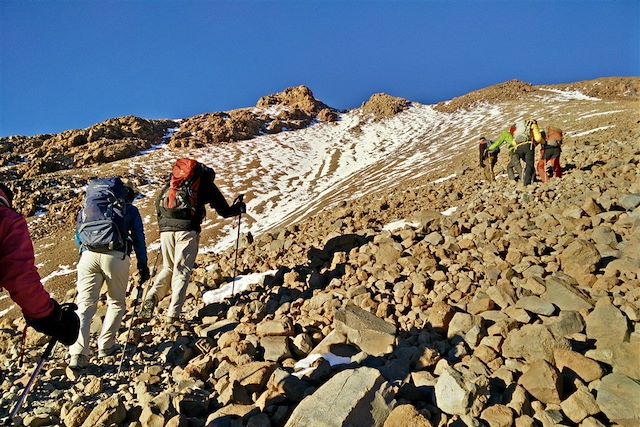Maintenant que nous sommes très bien acclimatés à l’altitude, nous pouvons faire l’ascension de l’un des plus hauts sommets de la région. Il nous faut environ 2h de jeep pour parvenir au départ du sentier. Suivant les conditions climatiques sur la zone et l’enneigement de la piste d’accès, plusieurs cas de figure s’imposent.