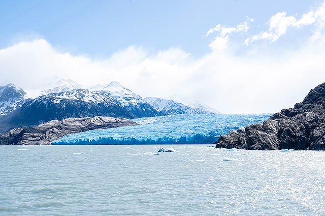 Nous reprenons notre minibus (environ 8 km) pour aller au petit embarcadère de Pudeto et prendre un bateau pour traverser le lac turquoise de Pehoé. Nous débarquons au camp Paine Grande et partons randonner le long du lac Grey jusqu'au mirador du glacier éponyme, l'un des plus imposants de la région. Sous la pression, le glacier craque et vêle de nombreux icebergs qui dérivent sur le lac et le parent de leur intense couleur bleue. Nous retournons au campement Pehoé en fin d'après-midi.