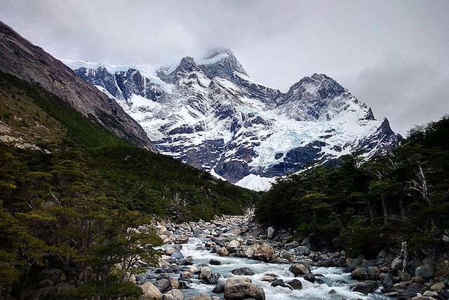 Nous traversons le village jusqu’à l’administration du parc, point de départ de notre randonnée en aller-retour. Le sentier monte progressivement à travers une magnifique forêt de lengas en direction du Pliegue Tumbado à 1298m. Ces arbres relativement bas nous donnent parfois la sensation d'être des géants dans une forêt. Au-delà de la limite de végétation, nous attend un formidable belvédère sur l’ensemble des massifs du Cerro Torre et du Fitz Roy. Nous pique-niquons face à ce panorama, à l'abri du vent. La vue porte jusqu’au lac Viedma tandis que nous retournons vers le village. Temps libre à El Chaltén pour savourer une bonne glace ou un chocolat chaud sur l’Avenida San Martin.