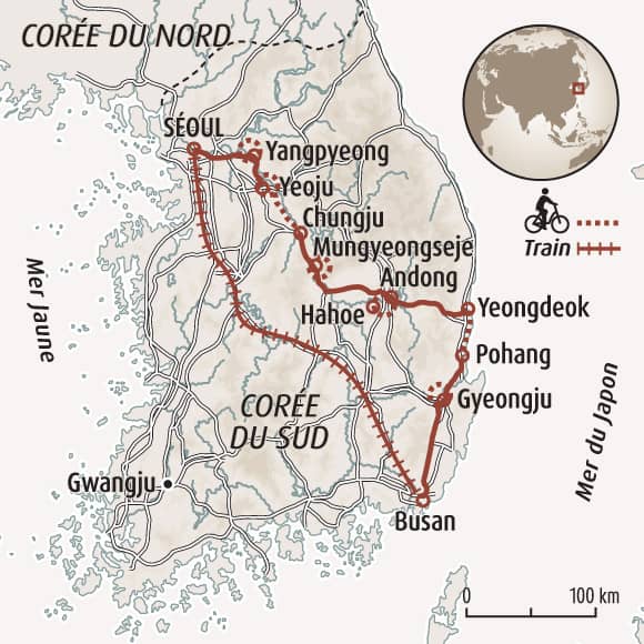 Entre traditions séculaires et modernité éclatante, la Corée du Sud se découvre ici au rythme du vélo électrique, le long de ses rivières et de ses côtes paisibles. Des berges du fleuve Han à Séoul jusqu’aux villages côtiers de la mer de l’Est, ce voyage traverse une mosaïque de paysages : montagnes boisées, campagnes verdoyantes, temples nichés dans la nature et villages traditionnels chargés d’histoire. Chaque étape dévoile un visage différent du pays — spirituel à Gyeongju, authentique à Andong, maritime à Yeongdeok et vibrant à Busan. Entre culture, nature et gastronomie, cette traversée est une invitation à goûter l’âme coréenne, entre douceur et vitalité.
