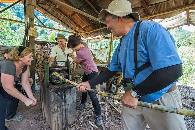 Matinée libre pour souffler un peu en milieu de voyage, et profiter de l'environnement paisible qu'offre la Coopérative. Outre les deux ponts suspendus qui relient divers points du hameau, des sentiers autoguidés sont à disposition. Après le déjeuner, activité de rappel le long d'un torrent et d'une petite cascade (3 rappels, 18 à 35m, environ 2h45 d'activité). Nous traversons un long pont suspendu étroit, avant de nous baigner dans le torrent passant au pied de nos bungalows. Dîner et seconde nuit à la montagne, bercés par le chant de la cascade.
