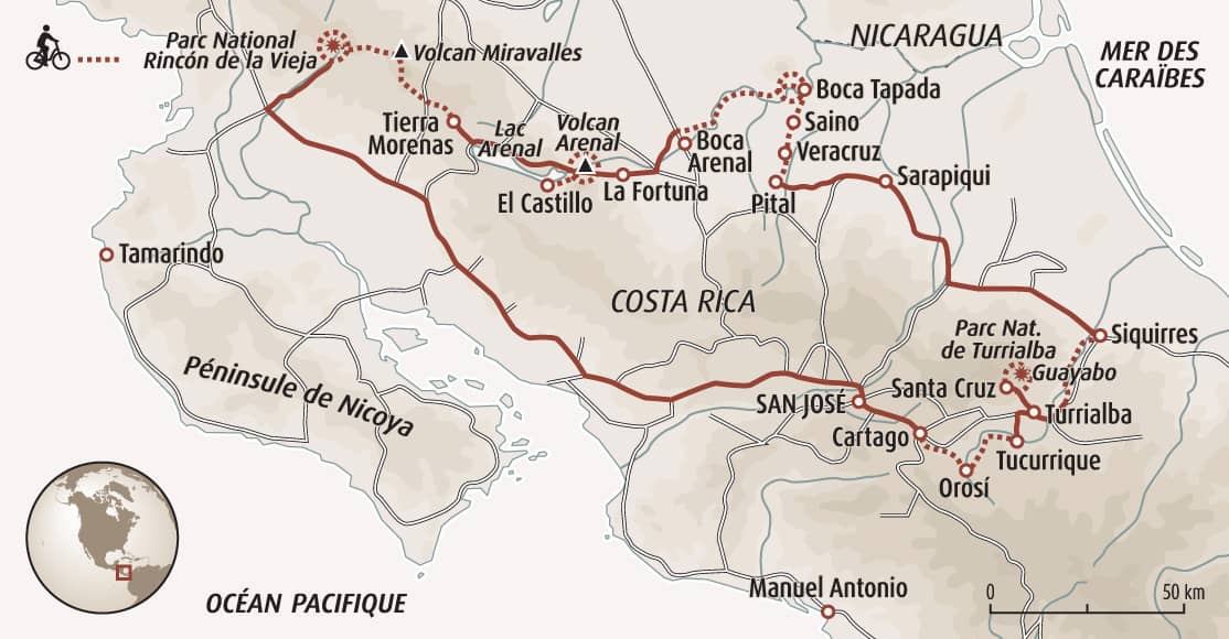 Tous nos transferts terrestres sont en minibus privé. Ce voyage a pour but de vous faire découvrir plusieurs régions du Costa Rica et ses ambiances variées. Découvrir le pays en 12 jours impose parfois des transferts, qui sont justifiés par la variété et la beauté des parcs nationaux et des milieux naturels. Nous avons souhaité réduire leur fréquence et leur longueur dans la mesure du possible, les étapes à vélos constituant l'activité principale du voyage, complétée par d'autres activités telles que des excursions à pied, en bateau, baignade ou de nombreuses rencontres et dégustations.