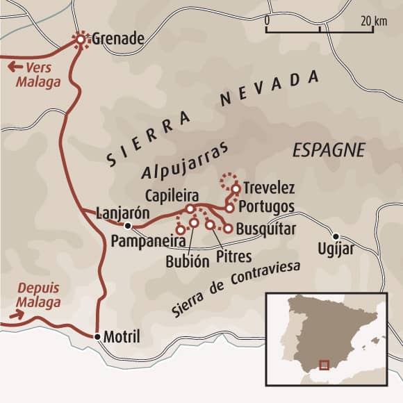 Au sud de Grenade, la Sierra Nevada dresse ses cimes élancées au-dessus de vallées suspendues, baignant dans la lumière douce de l’Andalousie. Ce massif sauvage, couronné par le Mulhacén (3 479 m), le toit de l’Espagne, abrite aussi des villages blanchis à la chaux, des vergers en terrasses et des sentiers ancestraux façonnés par des siècles de vie montagnarde. Nos pas nous mènent à travers les Alpujarras, terres d’héritage maure, où s’enchaînent forêts de châtaigniers, gorges profondes et belvédères naturels sur les hauteurs andalouses. Chaque soir, nous retrouvons le charme simple et chaleureux des hébergements de montagne, au cœur de hameaux vivants. Le voyage se savoure aussi par les papilles : fromages de brebis, jambon de Trevélez, huile d’olive locale... autant de saveurs authentiques partagées avec ceux qui font vivre cette région. Une immersion à pied au rythme du relief, entre nature puissante, traditions vivantes et douceur de vivre andalouse.