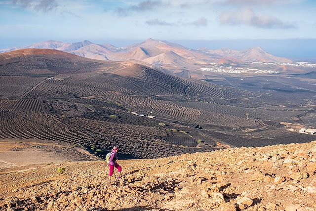 Notre randonnée nous fait découvrir les vignobles de La Geria, où s’est développé un spectaculaire système de culture sur cendres volcaniques poreuses et murets de protection du vent, permettant l’obtention d’un vin blanc remarquable, le Malvoisie volcanique (reconnu par l'Organisation Internationale de la Vigne et du Vin).