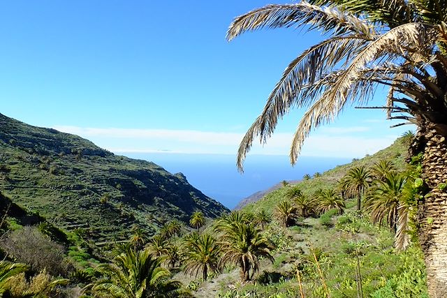 Depuis les crêtes, nous avons une vue panoramique de la vallée d'Alojera et ses cultures de palmiers ; nous redescendons par un petit sentier avec vue sur l’océan et l'île de Tenerife pour rejoindre notre point de départ.