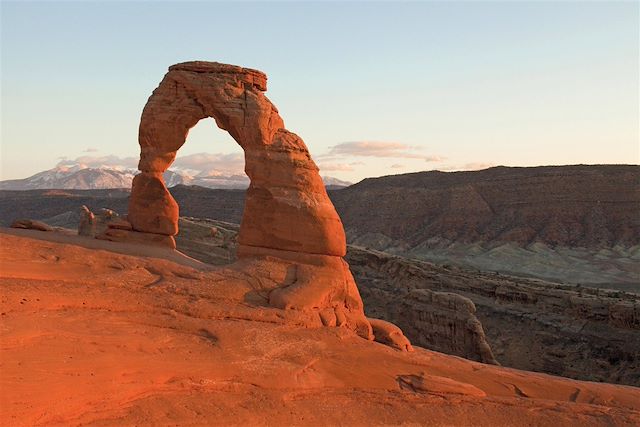 Spectaculaire journée dans le parc des Arches. Très chaud en été, il faut se lever de bonne heure et passer un long après-midi à l'ombre pour profiter des sites intéressants. Balades possibles dans différentes zones, avec notamment la "Cuisine du Diable", la pittoresque Delicate Arch et les montagnes de La Sal à l’horizon (1750m en moyenne).