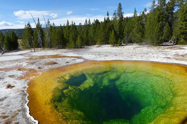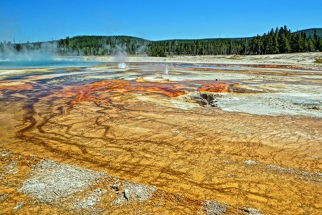 Découverte des plus beaux geysers du monde. Le site s'étend sur 3km, le long de la Firehole et sur 1,6km de large. 140 geysers, soit un cinquième du patrimoine mondial, sont répertoriés sur ce site. Ils sont répartis par groupes dont Old Faithful (2239m) est le plus célèbre. Comme son nom l'indique le "vieux fidèle", ne déçoit jamais ses admirateurs. Ses éruptions se produisent environ 20 fois par jour, atteignent une hauteur de 30-55m et une température de 103°C. Grand Geyser est le plus grand geyser prévisible ; ses éruptions surviennent deux à trois fois par jour sur une durée de 9 à 12mn pour une hauteur pouvant atteindre 60m. "Castle", avec son immense cône, est le plus grand du parc. Puis, il y a Sawmill, Turban Geyser, Spasmodic Geyser, sans oublier le Grand Prismatic, la plus grande source chaude du parc et la 3ème plus grande au monde. Par plusieurs sentiers nous prendrons la journée pour admirer et découvrir ces merveilles de la nature. Retour au camping en fin de journée.