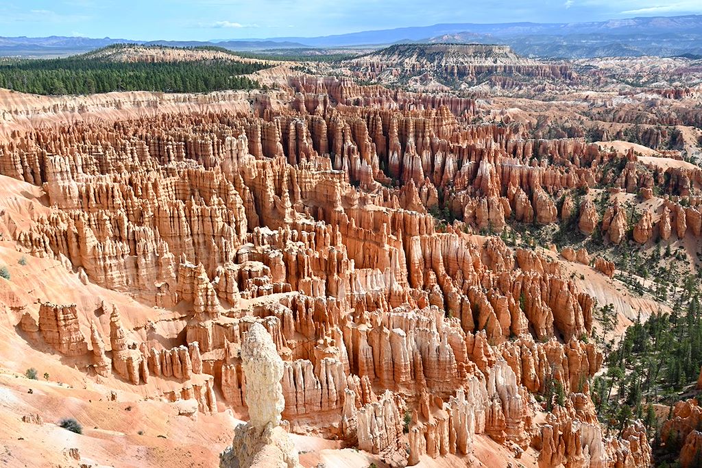 Bryce Canyon est situé sur le plus haut plateau de la région, où se sont d’abord établis quelques éleveurs de vaches, tel Ebenezer Bryce. Depuis le bord du Rim, notre regard porte loin sur cette mer de tourelles et pinacles de pierre sculptés par l’érosion. Mais pour vraiment l’apprécier, il faut descendre en son cœur. Randonnée dans le canyon sur le sentier Peek-a-Boo, qui serpente à travers les Hoodoos, ces tourelles couleur rose, orange, ocre et de toutes les formes. Les quelques pins, sapins et genévriers fournissent un milieu de vie pour nombre d’oiseaux, rongeurs et l’antilope d’Amérique. Une fois la nuit tombée, l’altitude, la qualité de l’air et l’absence de pollution lumineuse font de Bryce l'un des meilleurs endroits pour observer les étoiles. Nuit sous tente.