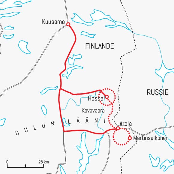 Une semaine de ski de fond en itinérance dans l'une des régions les plus sauvages du nord de l’Europe : Kainuu. En Finlande, vous êtes ici aux portes du Grand Nord, pour un raid à ski qui cheminera le long de la frontière russe. Après avoir skié dans une nature recouverte de neige, où seules les traces de vos skis se dessinent, vous vous arrêterez chaque soir dans des refuges confortables, tous équipés d'un sauna pour se détendre et reliés à l’électricité. Un itinéraire et des conditions d’hébergement excellents pour les voyageurs en quête d’une initiation au raid à ski et ceux qui préfèrent le confort du refuge à celui de la tente.