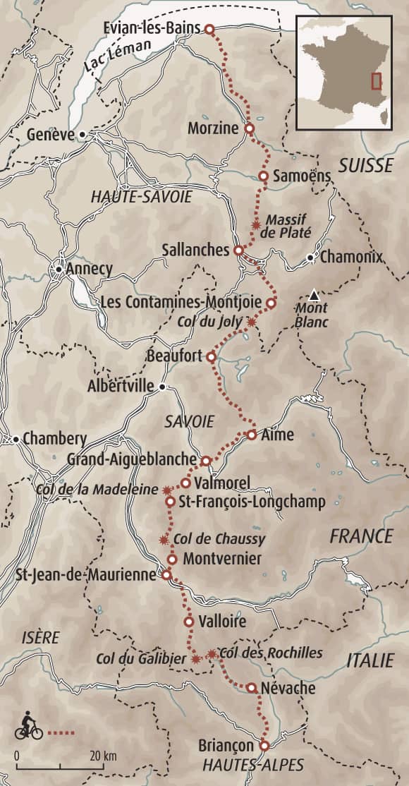 Du lac Léman à Briançon, cette traversée inédite vous mène au cœur des paysages majestueux des Alpes du Nord. Ici, pas d'itinéraire classique : place aux vallées verdoyantes, aux alpages fleuris et aux cols sauvages où l’on pédale en pleine nature. Porté par un enchaînement de petites routes, de pistes d’altitude et d’anciens chemins militaires, l’itinéraire dévoile les facettes les plus préservées des massifs du Chablais, du Beaufortain, de la Vanoise et des Cerces. Et lorsque se profile l’arrivée dans les Alpes du Sud, sous le regard majestueux du Mont Thabor, c’est toute la magie de cette aventure alpine qui se révèle. Une traversée hors des sentiers classiques, taillée pour ceux qui ont soif de grande évasion.