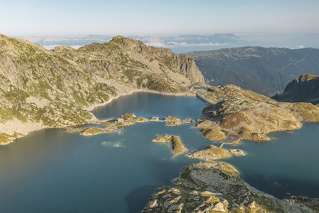 Traversée le long du lac du Crozet, suspendu au-dessus de la vallée. La journée se poursuit sur le flanc du massif, au-dessus de la vallée du Grésivaudan, avec la Chartreuse au loin. Votre seconde nuit se fait dans un petit refuge perché sur le versant Ouest, au soleil couchant.