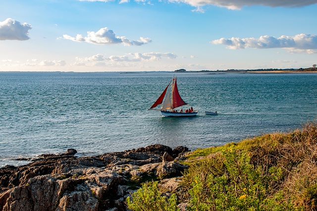 Au cœur du Morbihan, son célèbre golfe dessine une petite mer constellée d’îles, façonnée par les marées et les courants. Un voyage idéal pour celles et ceux qui apprécient les paysages marins et la découverte des îles à pied et en bateau. Depuis Vannes, nous pénétrons au cœur du Golfe du Morbihan et embarquons d’abord vers l’Île d’Arz pour suivre ses sentiers entre eau calme et petites dunes. Puis cap vers l’Île aux Moines où nous déambulons au gré de la côte, des anses et des petits ports. Notre cheminement nous conduit jusqu’à la presqu'île de Rhuys où l’océan Atlantique reprend ses droits. Les journées alternent marche, traversées en bateau et culture bretonne : une itinérance maritime vivifiante, qui resserre nos liens et rappelle combien la Bretagne se vit dans le mouvement naturel des paysages.