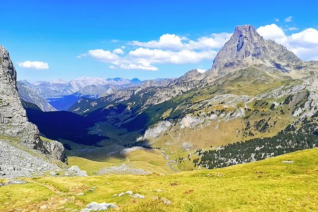 Nous partons de Gabas, porte d’entrée du massif de l’Ossau, et progressons entre vallées d’Ossau et d’Aspe. Le chemin nous mène vers les lacs d’Ayous, puis sur les crêtes du Chérue, avec le pic du Midi d’Ossau toujours en ligne de mire, silhouette minérale dressée à 2 884 mètres. À Lescun, le cirque et les aiguilles d’Ansabère ferment la boucle. Dans le parc national des Pyrénées, nous traversons estives et pâturages, croisons troupeaux et cabanes de bergers, témoins d’un pastoralisme encore actif. La marche se fait attentive, entre faune discrète, flore d’altitude et lumière changeante, dans un équilibre constant entre mouvement, nature et partage.