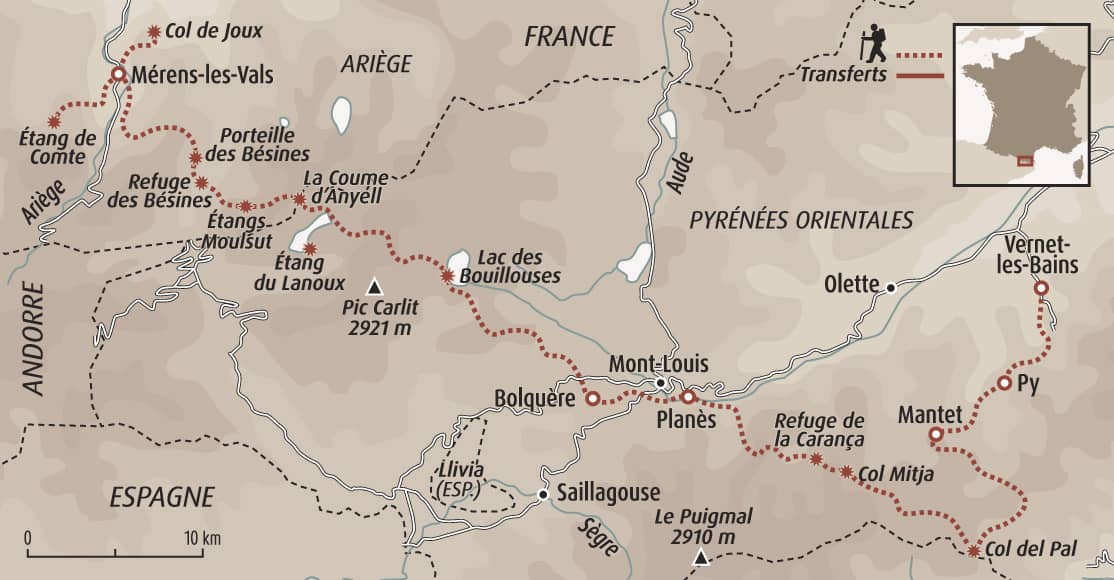 Nous partons de Mérens, là où la haute montagne ouvre le tempo. Le GR10 nous mène vers le refuge des Bésines, puis le lac des Bouillouses, sous les lignes franches du massif du Carlit. Le rythme se fait plus ample sur les plateaux du Capcir, vastes et lumineux. En descendant vers le Conflent, nous traversons des villages de pierre comme Planès ou Mantet, marqués par un patrimoine roman discret. Les gorges de la Carança et les réserves de Mantet et de Py apportent un contraste plus minéral et sauvage. L’arrivée à Vernet-les-Bains, au pied du Canigou, conclut cette progression sous une lumière catalane apaisante.
