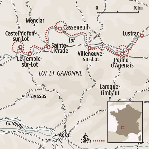 Au fil de la rivière, vous pédalez dans une campagne paisible, à travers vergers de pruniers et fermes en activité. Chemin faisant, de jolis villages au riche patrimoine culturel s’offrent à vous tels que Temple-sur-Lot ou Sainte-Livrade. Une journée douce et champêtre, bercée par la présence constante de l’eau.