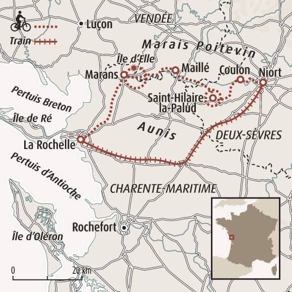 Pour la dernière journée de votre séjour à vélo, vous pédalez à la découverte des villages du Marais Poitevin. À Coulon, vous avez la possibilité de visiter la Maison du Marais Poitevin qui vous dévoilera toutes les merveilles et mystères de cette zone unique, classée Grands sites de France. Vous arrivez à Niort et son incontournable marché, élu plus beau Marché de France en 2024. Transfert en train jusqu'à La Rochelle.