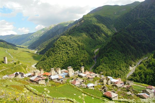 Nous mettons cap au nord pour prendre de l'altitude et gagner la région mythique de Svanétie, avec plusieurs arrêts en chemin. Magnifique région reculée, elle était longtemps isolée du pays la moitié de l'année. Elle compte plusieurs sommets de plus de 5000 mètres, glaciers et villages aux tours de pierre du XIIe siècle si particulières. De nombreuses légendes et mythes y perdurent, notamment celle de la Toison d'Or. Arrivée au village de Mestia en fond de vallée. En fonction de l'heure d'arrivée, nous pourrons visiter le musée d'art historique de la commune, sinon cette visite se fera le lendemain.