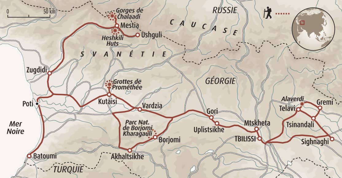 Ce voyage dessine une Géorgie complète et équilibrée, pensée comme une itinérance douce entre villes anciennes, paysages de montagne et régions viticoles. Il s’adresse aux voyageurs curieux qui aiment marcher tranquillement, prendre le temps de comprendre un territoire et multiplier les découvertes sans engagement physique soutenu. Nous commençons à Tbilissi, ville vivante et contrastée, avant de rejoindre la Kakhétie, cœur viticole du pays, entre monastères et vignobles. Le rythme se ralentit ensuite dans les paysages verdoyants de Borjomi et les plateaux minéraux de Vardzia. En Svanétie, les tours médiévales de Mestia et d’Ushguli accompagnent de belles balades accessibles, entre alpages et glaciers. Le voyage s’achève en douceur sur la mer Noire, à Batoumi, pour conclure cette traversée variée et cohérente de la Géorgie.