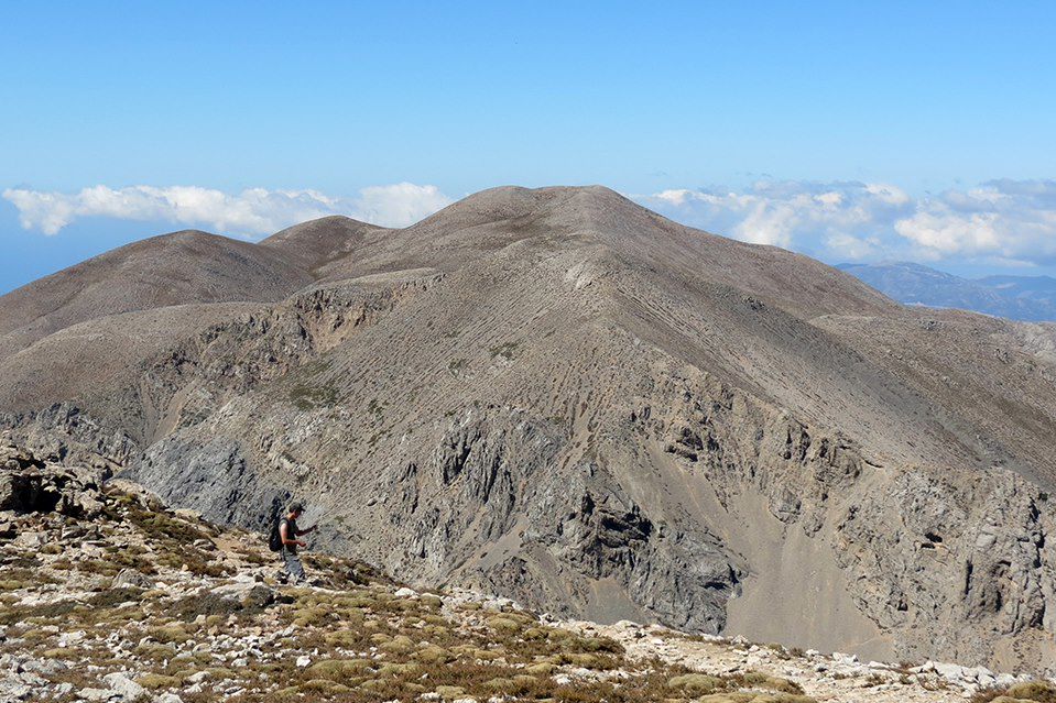 Arrivé au col nous apercevons au nord la mer Crétoise et la mer Libyenne avec l’ile de Gavdos au sud. Nous continuons notre ascension sur de la roche dure qui donne un bonne adhérence mais assez raide et impliquant l’aide des mains. Arrivée au sommet, nous avons une superbe vue panoramique sur La Canée, le mont Pachnes (2452m) et la côte sud de l'île. Nous entamons la descente par le même chemin et profitons d'une pause pique-nique.