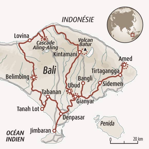 Un voyage idéal pour découvrir les beautés de l'île. Visite de temples, balade dans les rizières, pause fraicheur au bord des cascades, ascension du volcan Batur, snorkeling à Amed, sans oublier des rencontres avec les locaux et une nuit chez l'habitant. Un florilège de découvertes pour des moments inoubliables.