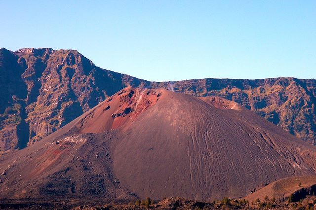 A 2100m, vous sortez de la forêt pour arriver dans un décor plus minéral, et surplombez alors les nuages ! Sur la dernière heure d’ascension, les roches volcaniques impliquent quelques passages un peu vertigineux jusqu’à arriver au "petit" sommet, à 2863m, non loin du cratère du volcan.