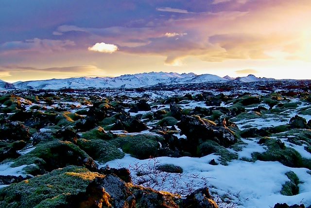 Nous traversons les plaines agricoles du sud avant de longer les glaciers Eyjafjallajökull et Mýrdalsjökull où la cascade de Seljalandsfoss, dont on peut faire le tour à pied, est postée en sentinelle. Arrêt à l'impressionnante chute de Skógafoss. Découverte des plages de sable noir, leurs formations d´orgues basaltiques, leurs pillow-lavas, typiques du sud de l'île. Toujours plus loin vers l’est, nous franchissons de vastes étendues de sable noir qui résultent des nombreuses éruptions sous-glaciaires, puis d'anciens champs de lave aujourd'hui recouverts d'une épaisse couche de mousse vert bronze. En route, selon la météo nous randonnerons en raquettes sur le monolithe de Hjörleifshöfdi ou le long des magnifiques gorges de Fjardrárgljúfur. Installation dans notre hébergement et veille pour l'observation des aurores boréales.
