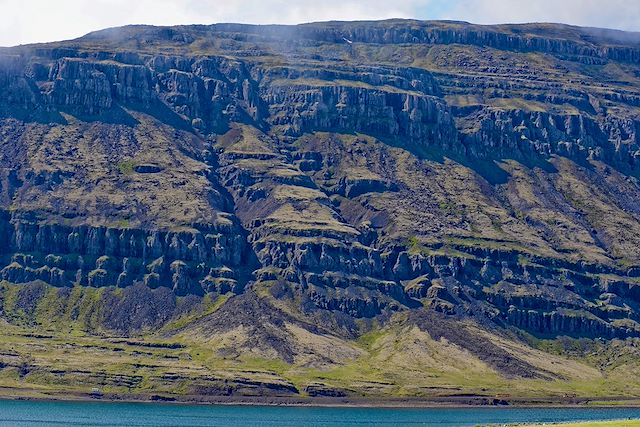 Nous quittons le cœur minéral du pays pour rejoindre les côtes. La route traverse les derniers plateaux désertiques, étendues silencieuses où la lave domine encore. Peu à peu, les couleurs changent. Le vert tendre des vallées succède au noir des scories, le bleu profond des fjords annonce le retour de l’eau. En chemin, nous approchons à pied les gorges de Hafrahvammagljúfur, entaille spectaculaire dans le basalte. Plus loin, la silhouette du Snæfell se détache. Volcan probablement éteint, il marque l’entrée dans l’est comme un repère, en écho au Snæfellsjökull de l’ouest, volcan éponyme. Nous nous installons pour la nuit dans la région des fjords.