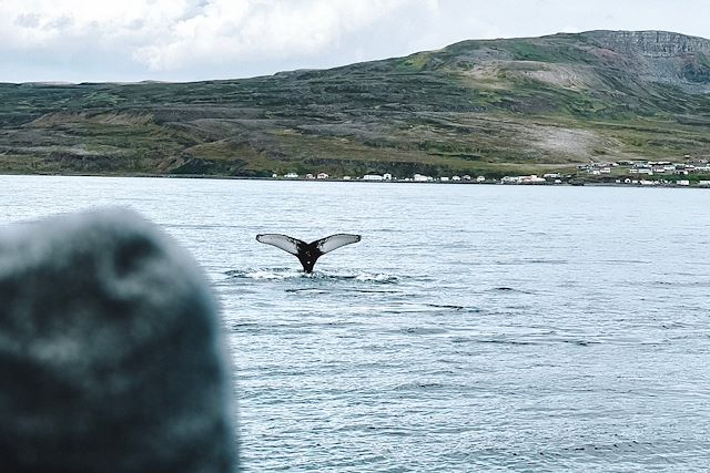 L’après-midi, nous embarquons pour une virée en bateau dans le fjord Eyjafjördur pour l'observation de mammifères marins. On scrute les flots. Au cœur du fjord, les baleines apparaissent. Moment suspendu, entre mer et terre.