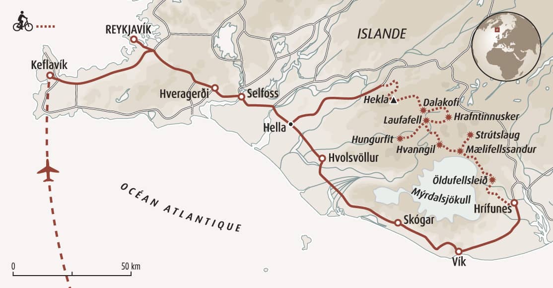 Ce voyage est conçu comme une parenthèse rare au cœur des hautes terres islandaises, une itinérance façonnée pour accéder à des territoires que très peu de voyageurs parcourent. Il s’adresse à des pratiquants aguerris, attirés par un engagement soutenu et par la possibilité de vivre une expérience hors normes grâce au VTT électrique et à une logistique experte. Depuis Reykjavík, nous gagnons les plateaux volcaniques dominés par Hekla avant de nous enfoncer dans la caldeira du Torfajökull, loin de toute route habitée. Déserts de sable noir, coulées de lave, glaciers proches et refuges isolés rythment une progression exigeante, où le silence, la lumière et l’ampleur du territoire prennent toute leur place. Une traversée singulière, confidentielle, qui se conclut sur la côte sud avant un retour vers la capitale.