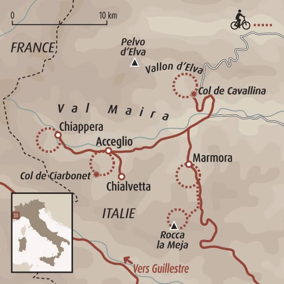 Le trajet entre la gare et le Val Maïra se fait sans remorque à vélo, les personnes venant avec leur propre VTT doivent donc arriver en voiture directement à l'hébergement.