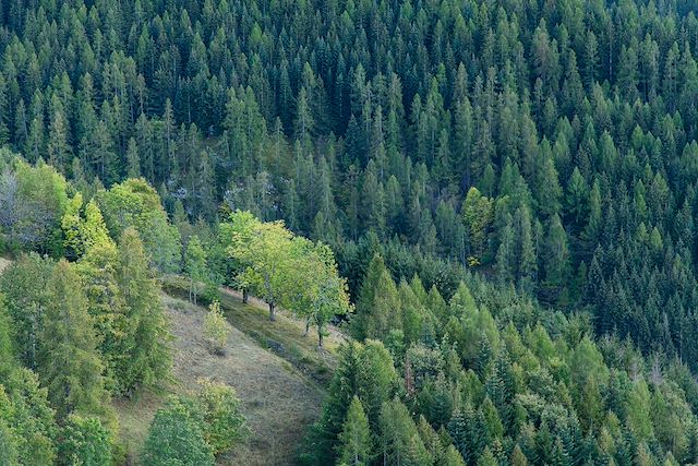 La descente est un véritable moment de plaisir au cœur d’une forêt de mélèzes, idéal pour le pilotage.