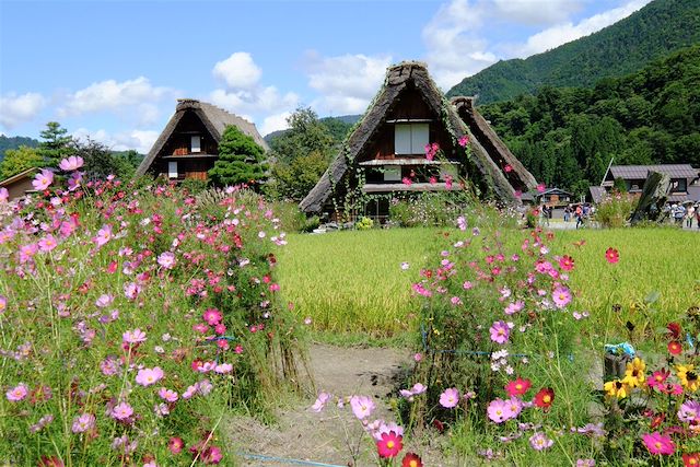 Départ pour Shirakawago, dans la vallée de Sho-kawa. Le village de Ogimachi à Shirakawa-go possède un grand nombre de maisons "gassho-zukuri" qui sont classées au patrimoine mondial de l'UNESCO depuis 1995. Ces grandes maisons en bois ont des toits très pentus en chaume pour résister au poids de la grande quantité de neige qui tombe en hiver. Le terme "gassho-zukuri" se réfère à la forme du toit qui représente la forme des mains durant une prière.