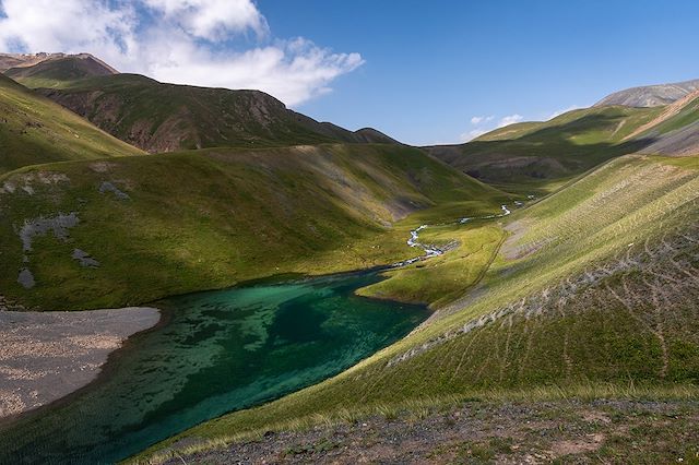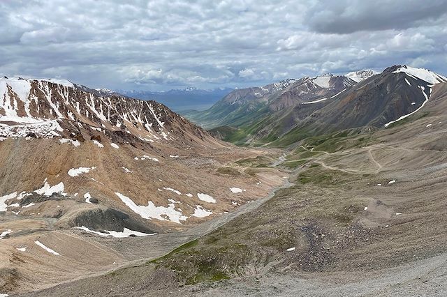Poursuite de notre trek le long d'une longue vallée constituée de prairies et cernées de sommets montagneux. Nous sommes ici dans une zone isolée et sauvage des Monts Terskey. Avec un peu de chance, nous pourrons croiser des nomades et leur troupeaux, qui ont l'habitude de se déplacer de jour en jour dans cette région.