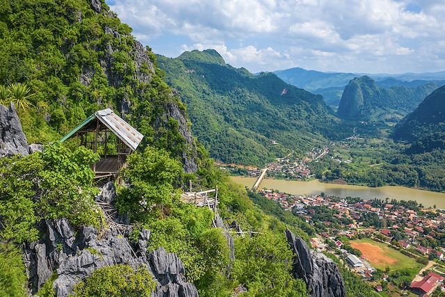 Nous grimpons jusqu'au sommet d'une colline surplombant Nong Kiaw et la rivière Nam Ou, en suivant un petit chemin au milieu de la forêt. La montée est raide et se fait sur un chemin de terre, de pierres et de racines, assez technique et physiquement exigeant (certains passages sont aménagés avec des marches, balustrades et mains courantes en corde). Arrivés au sommet du piton rocheux, nous serons récompensés par un panorama spectaculaire à 360° sur les montagnes, la rivière Nam Ou et le village de Nong Kiaw. La randonnée se fait sur 4km avec 460m de dénivelé positif.