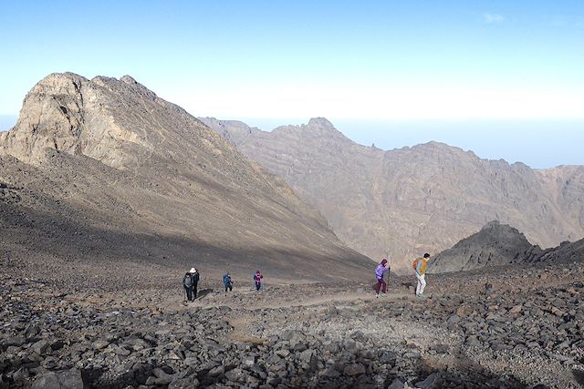 Très tôt le matin (prévoir lampe frontale), départ pour l'ascension du «?seigneur de l’Atlas?», point culminant de l’Afrique du nord (4167m). Puis longue descente par la voie nord en direction du village d’Imlil à 1800m. Installation, dîner et nuit en gite de montagne standard.