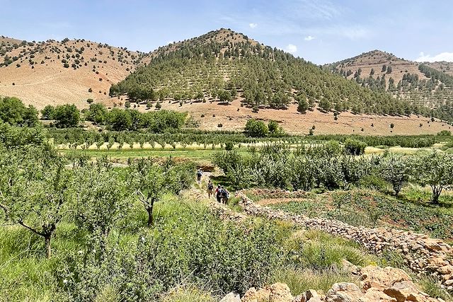 Longue et jolie étape de randonnée par un sentier de transhumance jusqu’à la crête d'Igoudamen (3000m), barrière naturelle qui sépare la vallée du M'Goun et celle des Bougmez davantage peuplée. Poursuite de la descente par un sentier en lacet jusqu’à la fertile vallée des Ait Bougmez : traversée des jardins du vieux village de Tabant avant d’atteindre votre hébergement pour la nuit.