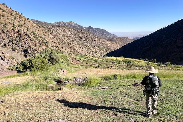 Randonnée en direction du beau village rouge de Rouguelt. Déjeuner pique-nique. Continuation par l'Assif N'Wagga, joli vallon encaissé caractérisé par sa forêt dense de genévriers thurifères, poursuite jusqu’aux bergeries d’altitude. Installation du bivouac à proximité d’une source à 2600m.
