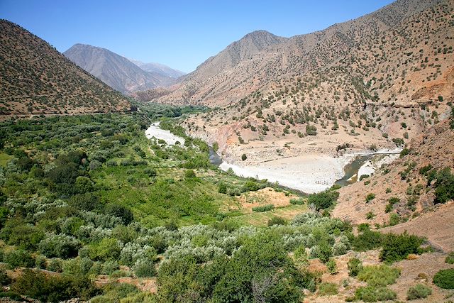 Nous entamons la journée par l’ascension du col de Tamatert. À mesure que nous prenons de l’altitude, les panoramas s’élargissent sur les crêtes de l’Atlas. Nous plongeons ensuite dans la vallée d’Imnane par une route sinueuse traversant une succession de villages. Après le déjeuner, une longue descente nous mène à Imsker avant de rejoindre Asni. La dernière montée par la piste sauvage du djebel Khalout demande engagement et régularité, avant une descente fluide jusqu’aux Terres d’Amanar, nichées au cœur de la forêt.