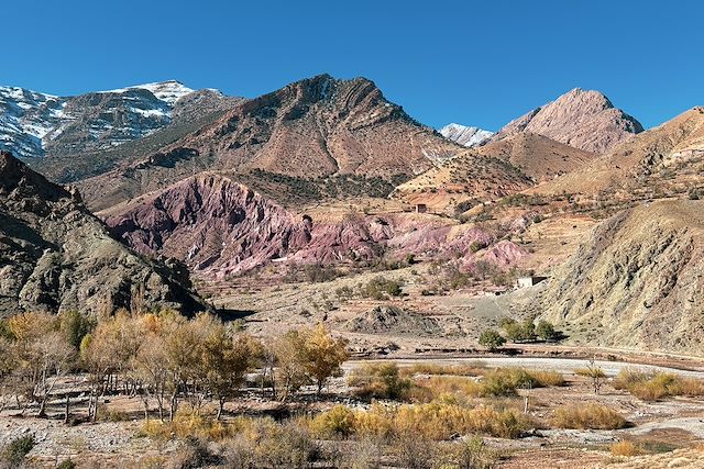 Nous quittons la vallée par une ascension progressive vers le Tizi n’Tirghist. En prenant de l’altitude, les vues s’élargissent sur le massif du M’Goun et l’ensemble des Bougmez. La journée alterne cols d’altitude, plateaux minéraux et longues descentes. Une piste spectaculaire en balcon nous conduit jusqu’à la cathédrale de rocher, impressionnante falaise dominant la vallée.