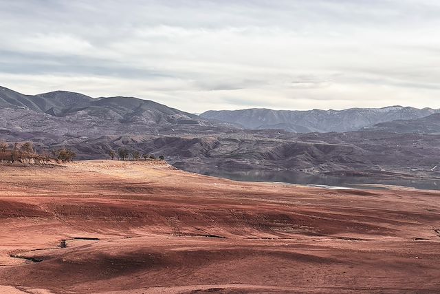 Nous attaquons une belle montée par une petite route quasi déserte pour franchir le Tizi Aït Aabdi. Depuis le col, nous traversons de vastes plateaux fréquentés par les bergers nomades en saison. La descente qui suit change d’ambiance, avec l’apparition des genévriers thurifères et de petites vallées agricoles. Après une dernière piste roulante, nous rejoignons notre véhicule et gagnons le lac de Bin el Ouidane, que nous traversons en barge pour rejoindre notre écolodge.