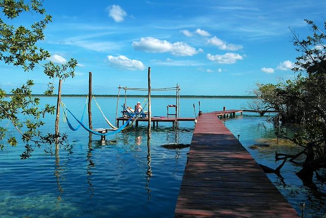 Journée de détente à Bacalar. Nous partons au lever du soleil pour une découverte de la lagune en kayak double. Baignée par la lumière douce du matin, la lagune révèle ses différents tons de bleu et ses eaux calmes sont idéales pour observer les récifs. En fonction des conditions de navigation, nous pagayons tour à tour le long des canaux qui traversent la mangrove, autour de l’île aux oiseaux ou encore sur le cenote negro. Retour à Bacalar en fin de matinée et visite de ce village classé "pueblo mágico" grâce à sa situation au bord de la lagune et à ses fortifications. Déjeuner dans un comedor du village avant de regagner l’hébergement et de profiter à son rythme d’une après-midi libre.